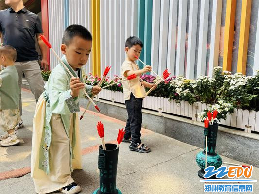 在“礼乐投壶”游戏区,孩子们手持箭矢,全神贯注地瞄准远处的壶口,用力投掷。“投中啦!”每当有孩子成功投中,现场就会响起热烈的欢呼声和掌声,孩子们在一次次尝试中,感受着传统游戏的魅力。