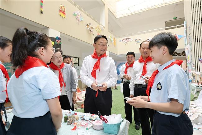 淮河路小学构建“润根育人”生命教育体系,着力培养德高、体健、智睿、行雅的莘莘学子。在学校门口,少先队员为刘宁一行戴上鲜艳的红领巾。刘宁来到同学们中间,与大家亲切交流,饶有兴致地参观了“童趣非遗学生作品展”,还来到操场、科创中心等地,详细了解网球特色课程、科学社团教育开展情况。他说,浇花浇根、育人育心,希望大家探究知识、学会审美、强健体魄,培养兴趣爱好和科学素养,不断提高心理素质,促进德智体美劳全面发展,从“小树苗”早日成长为栋梁之材。