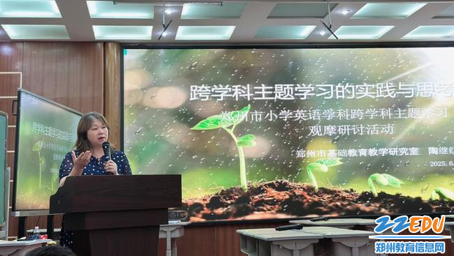 活动最后,郑州市基础教育教学研究室小学英语教研员陶继红作总结讲话。陶继红首先感谢三位授课教师及其教研团队为大家带来的三节优秀课例,同时希望通过跨学科主题学习研讨为教师和学生们带来教学方式和学习方式的改变。陶继红指出,学生应在课堂中主动选择学习内容、发现问题、分析和解决问题,不是单纯学语言,更要注重运用语言。教学中教师要敢于放手,让学生探索、发现并主动地运用英语和各学科融合知识解决问题。