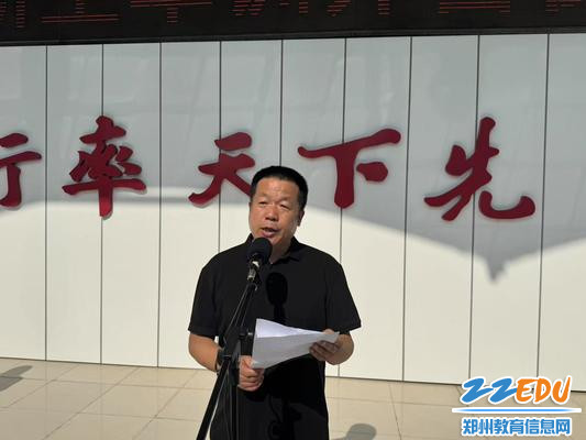 李国喜在致辞中向承训教官致以崇高敬意,向陪伴老师表达衷心感谢,并热烈欢迎2025级新生加入郑州市第一〇一中学这个大家庭。李国喜表示,军训是对坚韧不拔、纪律严明、精诚团结、爱国担当的抗战精神的致敬与传承,是同学们在高中生涯中锤炼意志、锻造品格的重要第一课。他希望同学们能铭记历史,在磨砺中传承先辈爱国报国的精神;严守纪律,在集体中淬炼严于律己的品格;奋勇争先,在挑战中展现青春昂扬的风采。