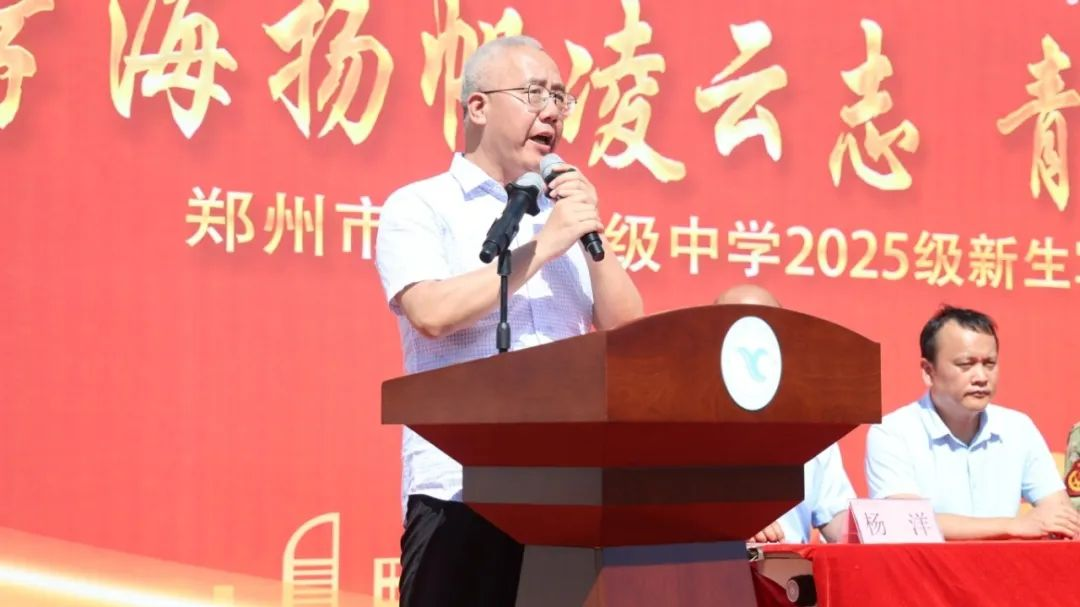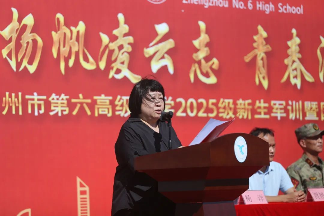 开营仪式上,郑州市第六高级中学党委书记董慧蕴发表讲话。她寄语同学们:“要以军人为榜样,传承光荣传统,将国防意识深植心中,让爱国主义精神与集体主义精神融入血脉。军训是青春的淬炼,唯有经风雨、耐酷暑,方能锻造坚韧品格,为三年高中路筑牢根基。”