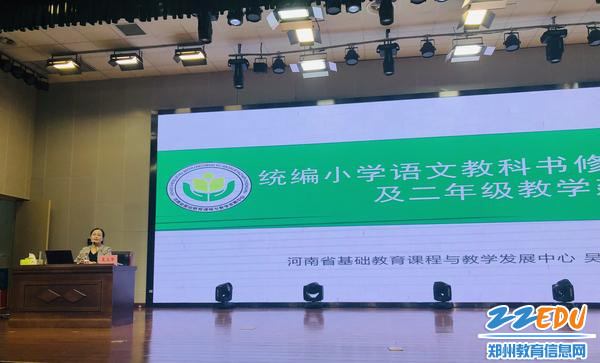 当日上午,河南省基础教育课程与教学发展中心教师发展部副主任、小学语文教研员吴玉华以《统编小学语文教科书修订情况介绍及二年级教学建议》为题展开专题讲座,从课标、教材、教学三个维度展开论述。
