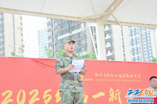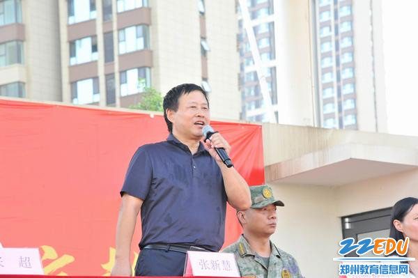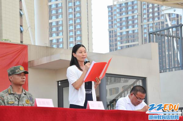 郑州市扶轮外国语高级中学党总支书记张新慧宣布军训开始