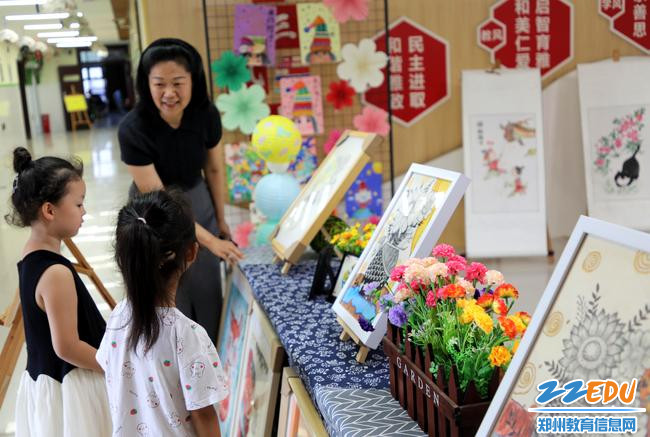 惠济区艺术小学党支部书记、校长杨丽梅与孩子们驻足欣赏展示的画作。