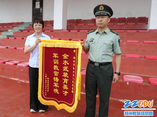 在颁奖环节,副校长陈晓宣读了军训先进集体获奖名单。学校领导为在合唱比赛、手抄报评比、内务卫生、队列会操等项目中表现突出的班级颁发了奖项,表彰他们在军训期间的优异表现。学校党委书记周继莉代表学校向金水区人民武装部赠送锦旗,表达对承训官兵的诚挚谢意和军民之间的深厚情谊。