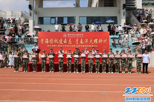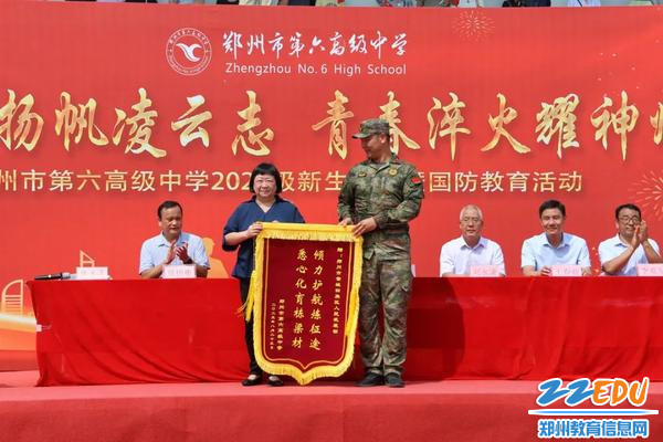 仪式最后,郑州市第六高级中学党委书记董慧蕴为军训教官授锦旗。红色锦旗上,“倾力护航炼征途,悉心化育栋梁材”十四个金色大字熠熠生辉,既是郑州市第六高级中学全体师生对教官们连日来悉心指导、严格训练的诚挚感谢,也定格了这段迷彩时光的温暖记忆。