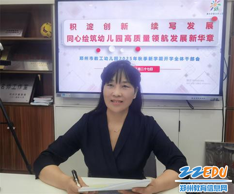 为明确新学期发展方向,确保各项工作有序推进,8月27日,郑州市教工幼儿园召开2025年秋季新学期开学全体干部会,以“积淀创新,续写发展,同心绘筑幼儿园高质量领航发展新华章”为主题,全面回顾暑期工作,传达上级会议精神,部署秋季开学及新学期重点任务。