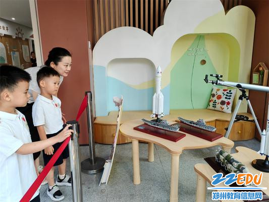 课程来源于生活,园所内精心设置的“大国重器”展台,更是吸引了孩子和家长们的目光。展台上,摆放着高铁、载人飞船、战斗机等模型,每一个模型都制作得栩栩如生。孩子们围在展台前,好奇地观察着各个模型,不时向家长提问:“这个高铁跑得很快吗?”“飞船能飞到太空吗?”家长们则借着模型,向孩子们讲述着中国在科技、交通、航天等领域取得的辉煌成就。展台前,大家热烈讨论着,爱国的种子在孩子们心中悄然萌芽。