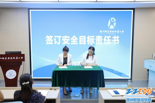 郑州师范学院附属小学党总支书记、校长王慧,副校长王燕玲,后勤保障中心主任郭雯雯,安全专干尉汉飞作为代表上台签订了新学期安全目标责任书。安全目标责任书的签订,让每位教职工能够在思想上树立起校园安全意识,并责任牢记于心,将校园安全工作落到实处,为郑州师范学校附属小学立人教育高质量发展交出满意答卷。