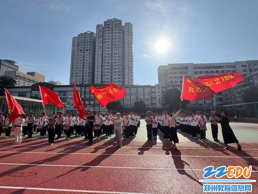 教官们也为学生们进行了风采展示,各班学生代表为尊敬的教官们佩戴上了红领巾,各班班主任又郑重地将班旗交于班长手中……整个活动中,仪式感满满,师生们也激情满满。