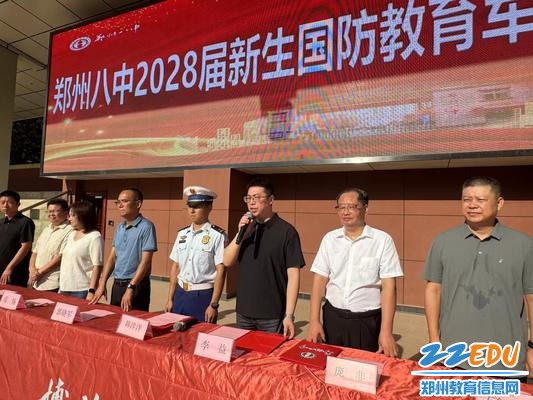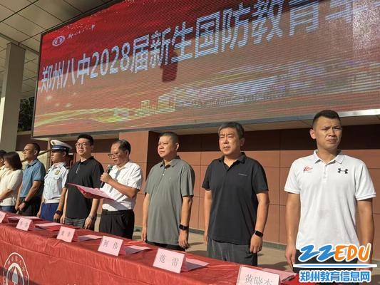 在鲜红的班旗映衬下,在斗志昂扬的气氛中,郑州市第八中学校长李益正式宣布:2028届新生国防教育军事体验课开营!