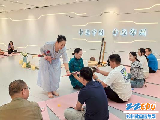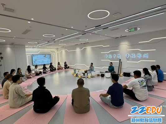 活动伊始,在郑州市金融学校副校长马俊武的带领下,教师们遵循指引脱鞋净手,安静入场。在专业导师的引导下,大家通过调整呼吸渐入佳境。空灵深远的颂钵声响起,教师们戴上蒸汽眼罩,平躺于垫,跟随指令放松身心。钵体传出的和谐振动,宛如清泉涤荡心灵,带来深层次的宁静与净化。