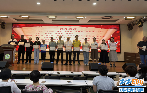 诗朗诵结束后,大会进入表彰环节。郑州市第二十四中学校长郭鹏先后宣读了表彰2024-2025学年校级优秀教师、优秀教育工作者、优秀共产党员的名单。在热烈的掌声和欢快的乐曲中,受表彰的教师们精神抖擞地依次走上主席台,从学校领导手中接过承载着荣誉与肯定的证书。这些优秀教师们,他们深耕教学一线,以渊博的学识启迪学生智慧,以高尚的师德塑造学生心灵;他们默默奉献在服务岗位,保障着学校各项工作的顺畅运行,是教育事业坚实的后盾;他们坚守初心使命,在教育教学和管理服务中充分发挥先锋模范作用,以实际行动诠释着责任与担当。他们的先进事迹,集中体现了新时代人民教师的光荣形象和崇高品格,是全校教职工学习的榜样。