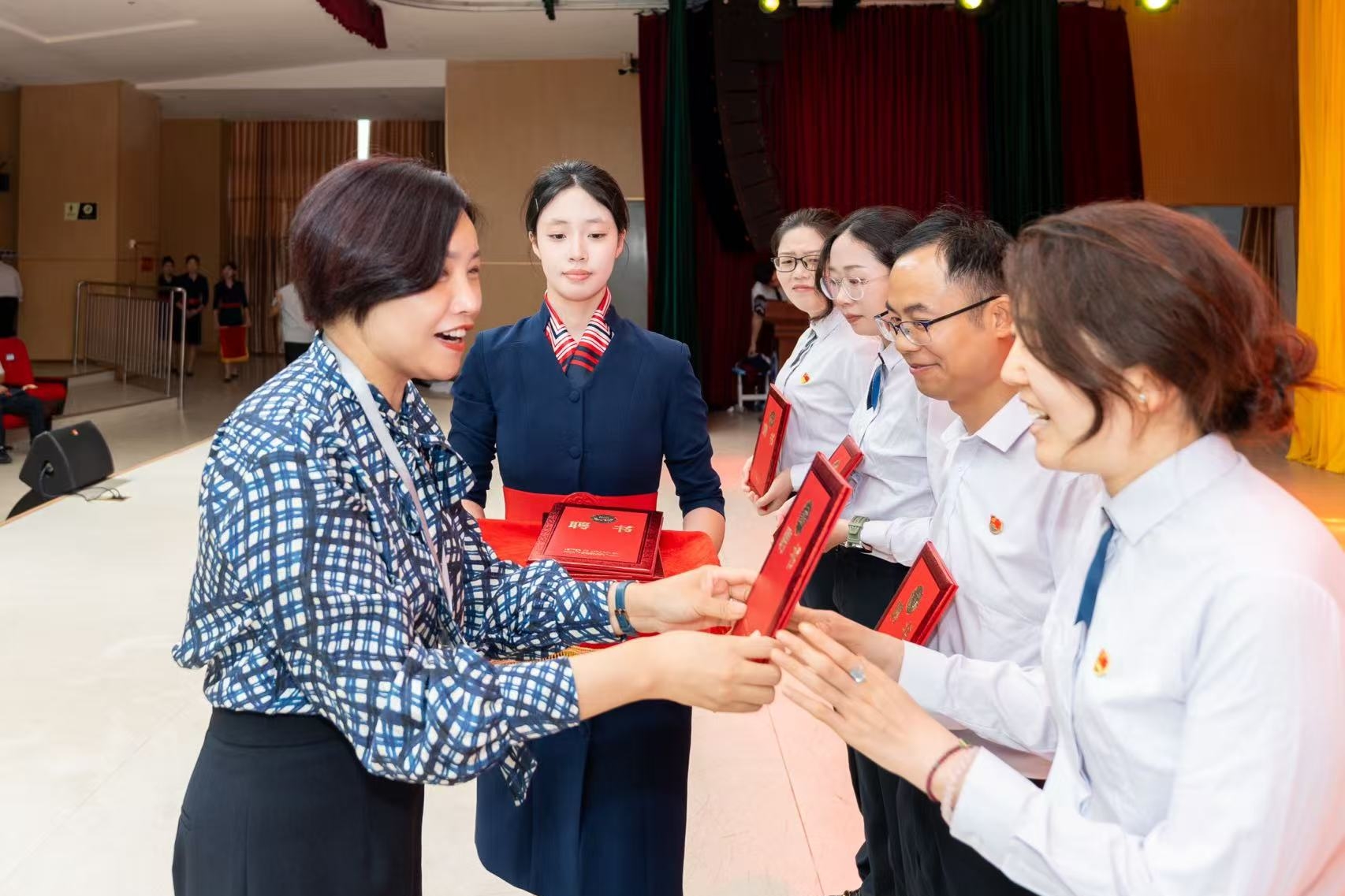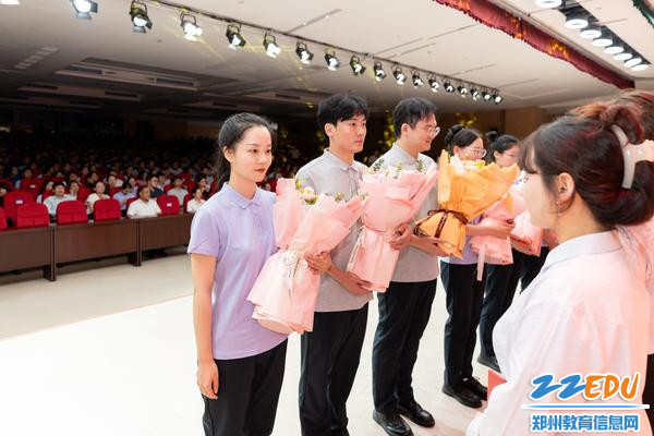 仪式首个篇章聚焦成长,21位新任教师依次登台讲述教育理念。“一棵树摇动另一棵树”“用智慧点亮童心,用陪伴静待花开”等真挚话语,饱含着他们对教育事业的热忱与期许。当新任教师的照片在大屏幕上滚动展示时,台下学生瞬间沸腾,熟悉的面孔让大家兴奋不已,有的学生激动地挥舞着手,有的小声与身边同学分享“这是我们班的新老师!”,阵阵欢呼与掌声交织,为这场成长之约注入了最温暖的互动力量。