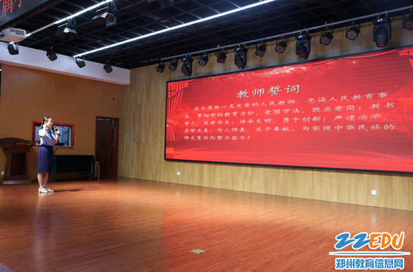 誓词篇“铭记初心,使命在肩”环节,四位新入职教师作为代表,上台与郑州师范学院附属小学党总支书记、校长王慧签订《师德师风承诺书》,每一位教师对自身肩负的责任有了更深刻的认知。在王慧的领誓下,全体教师重温《河南教师誓词(试行)》,铿锵有力的誓言回荡在现场,再次点燃了每一位教师的教育初心,也让大家对教师职业的荣誉感与使命感愈发强烈。