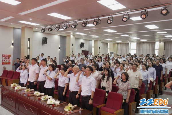 在郑州市商贸管理学校党委书记马越雁的带领下,全体教师庄严宣誓,铿锵誓言回荡在报告厅内,彰显了郑州市商贸管理学校教师队伍坚定的教育信念与崇高的职业追求。