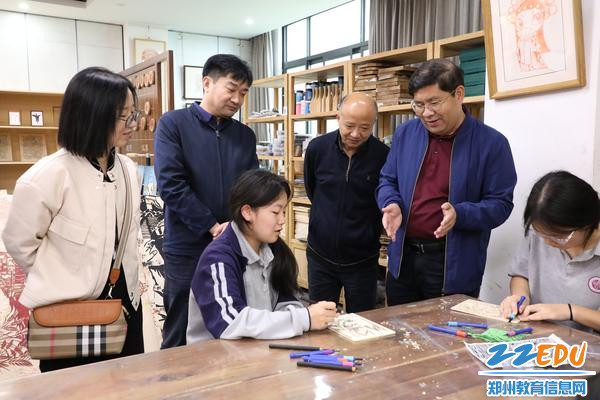 为了更深入了解学校发展特色,一行人来到学校非遗中心实地考察。烙画、面塑、剪纸……富有中原文化特色的非遗作品让一行人感到惊艳。学生们精湛的技艺和专注的创作状态,得到了一行人的高度赞扬。他们不时驻足观看,并与正在进行创作实践的师生亲切交流,深入了解非遗课程的开设情况、传承模式以及美育融合的实践路径。