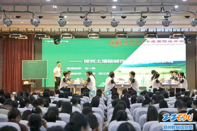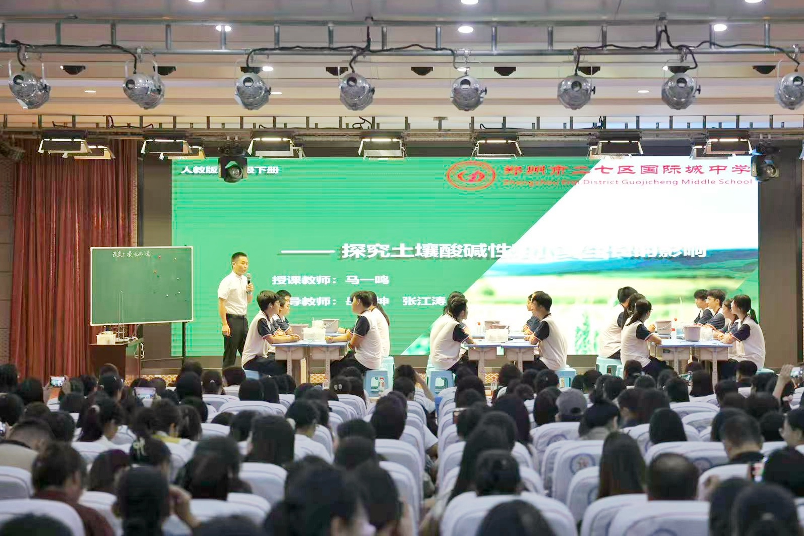 其次,会议进行现场课观摩展示。来自郑州市二七区国际城中学的马一鸣老师带来了一节题为《改良土壤,化说小麦》的生动课堂。该课基于河南省独特的地理环境,探究了土壤酸碱性对小麦种子生长的影响,并归纳了酸碱的化学性质。马一鸣以扎实的专业功底、巧妙的教学设计和活跃的课堂互动,融合了数字传感器和人工智能等信息化手段,充分展现了“以学生为中心”的教学理念,聚焦学科核心素养的落地,引发了与会教师的深入思考和热烈讨论,为观摩教师提供了宝贵的教学范例。