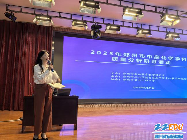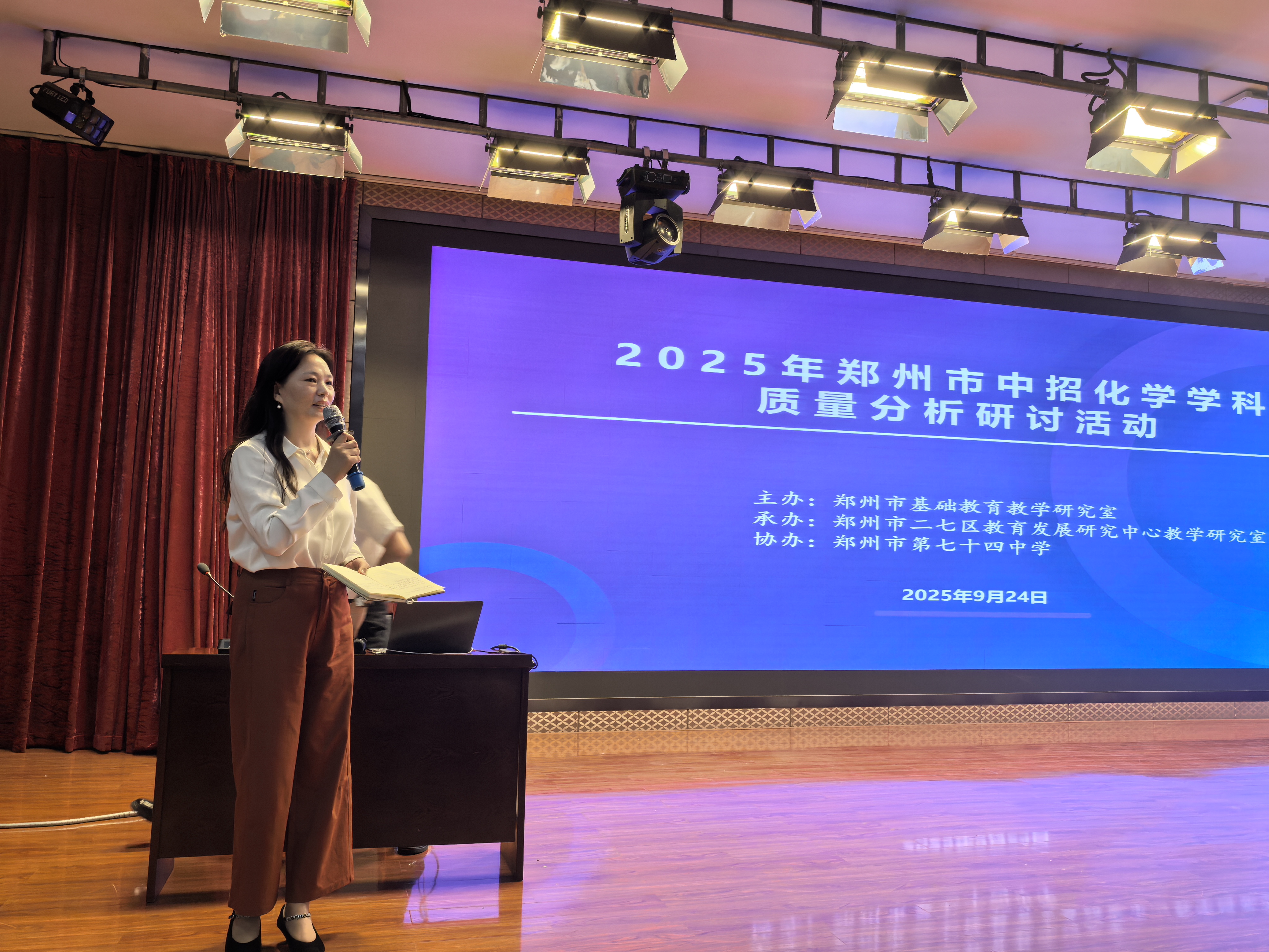 为深入分析郑州市中招考试化学学科情况,总结备考经验,明确教学方向,进一步提升全市初中化学学科教学质量和备考效率,2025年郑州市中招化学学科质量分析研讨活动于9月24日下午在郑州市第七十四中学召开。本次会议由郑州市基础教育教学研究室主办,二七区教育发展研究中心教学研究室承办,特邀河南师范大学刘玉荣教授带领2025年河南省义务教育师资薄弱环节改善暨中小学教师素质提升工程——省级骨干教师培育项目初中化学培训班学员出席。郑州市基础教育教学研究室理科部主任、化学学科教研员岳莉坤,各区县(市)教研员及全市各初中学校的600余名化学教师齐聚一堂,共同参与这场聚焦质量、分享经验、凝聚共识的教研盛会。
