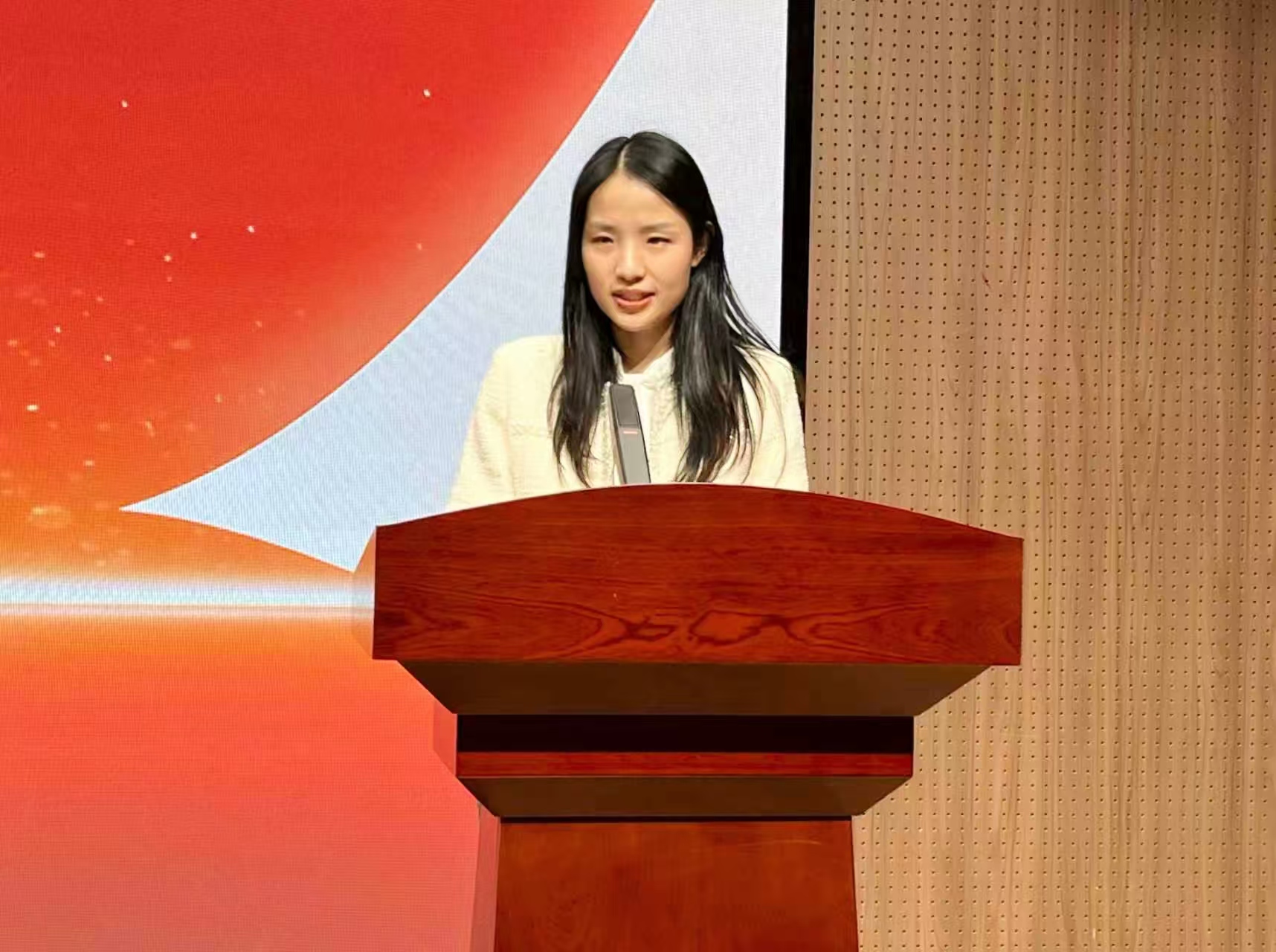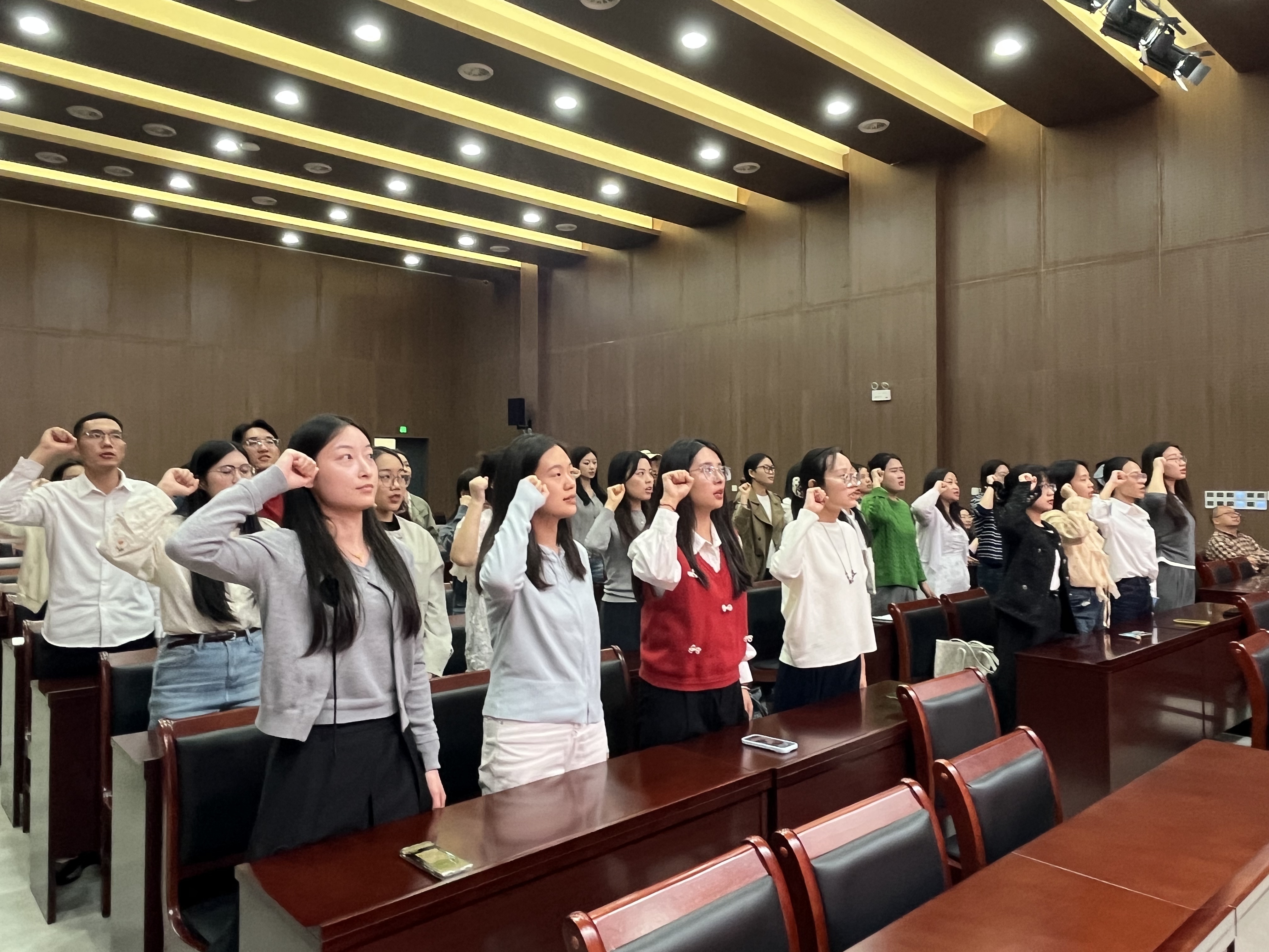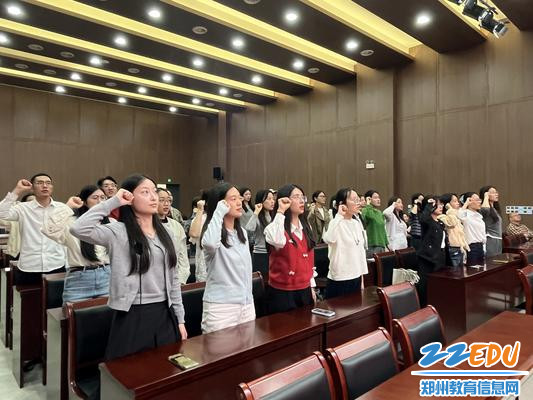 “我志愿成为一名人民教师,忠诚党的教育事业,遵守教育法律法规……”在领誓人陶梦婷老师的带领下,全体青年教师高举右拳,庄严宣誓。铿锵誓言回荡在报告厅,更深深烙印在每位教师心中。