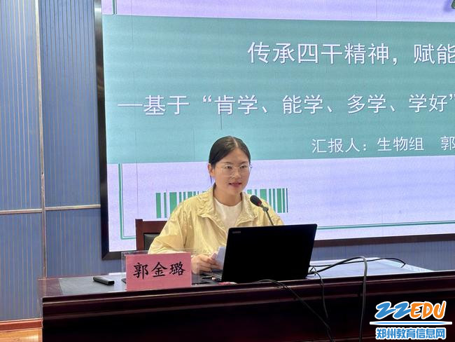 郑州市管城回族区外国语学校教师郭金璐以“四干精神”为主线,作《传承四干精神赋能生物备考》主题分享。郭金璐从“肯学、能学、多学、学好”四环节入手,通过虚拟实验、分层指导、跨学科实践等方式激发学生学习动力,提高备考效能,为与会老师提供了可借鉴的实践范例。