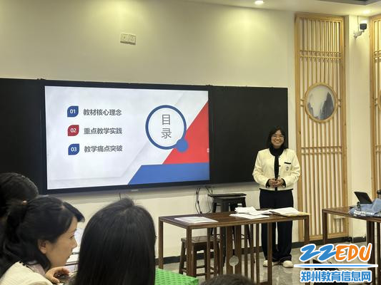 接着,郑州市名师、中心教研组成员董艳鄂进行了《从理念到课堂的跨越》专题讲座,她分享了今年暑假在中职语文国家级示范现场培训中的学习心得。她首先与大家交流了统编教材的三个核心理念,接着针对统编教材中表达与交流、古代诗文作品选读等重点教学实践中的痛点问题进行一一分析,最后,就这些教学痛点问题逐点介绍突破方法,带给现场的老师们有益的启迪和积极的思考,与会老师们认真倾听、受益匪浅。