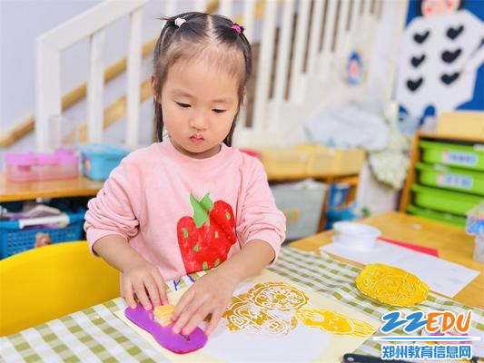 走进中班教室,热闹的“拓印月饼”手工活动正精彩上演。为让孩子们更好地感受中秋元素,老师们提前做好充足准备,不仅定制了造型各异的自制月饼印章,还搭配了色彩鲜亮的各色颜料与质感细腻的画纸,更通过实物展示不同花纹的月饼图案,直观呈现传统月饼的精巧造型,激发孩子们的创作兴趣。活动中,孩子们瞬间化身为“小小糕点师”,神情专注又认真。只见他们一手稳稳按住画纸,一手紧握蘸满颜料的月饼“印章”,轻轻向下一压,一个个带着清晰花纹的“月饼”便鲜活地跃然纸上。不少孩子还充分发挥奇思妙想,用黄色颜料点缀“蛋黄”,用棕色颜料勾勒精致“花纹”,让笔下的“月饼”愈发生动逼真。“我要拓印一个最漂亮的送给妈妈!”稚嫩的话语与欢快的笑声交织在一起,满是孩子们对中秋佳节的期待,以及对家人最纯粹的爱意。