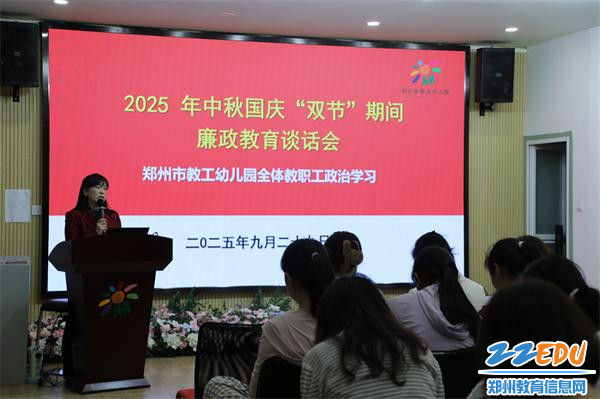 为营造风清气正的节日氛围,筑牢校园安全防线,郑州市教工幼儿园于9月29日晚召开2025年中秋、国庆“双节”廉政教育与安全工作专题会,会议围绕廉洁自律与校园安全两大主题展开,郑州市教工幼儿园党支部书记、园长陈春主持会议,全体教职工参会。