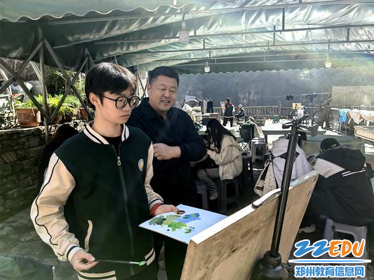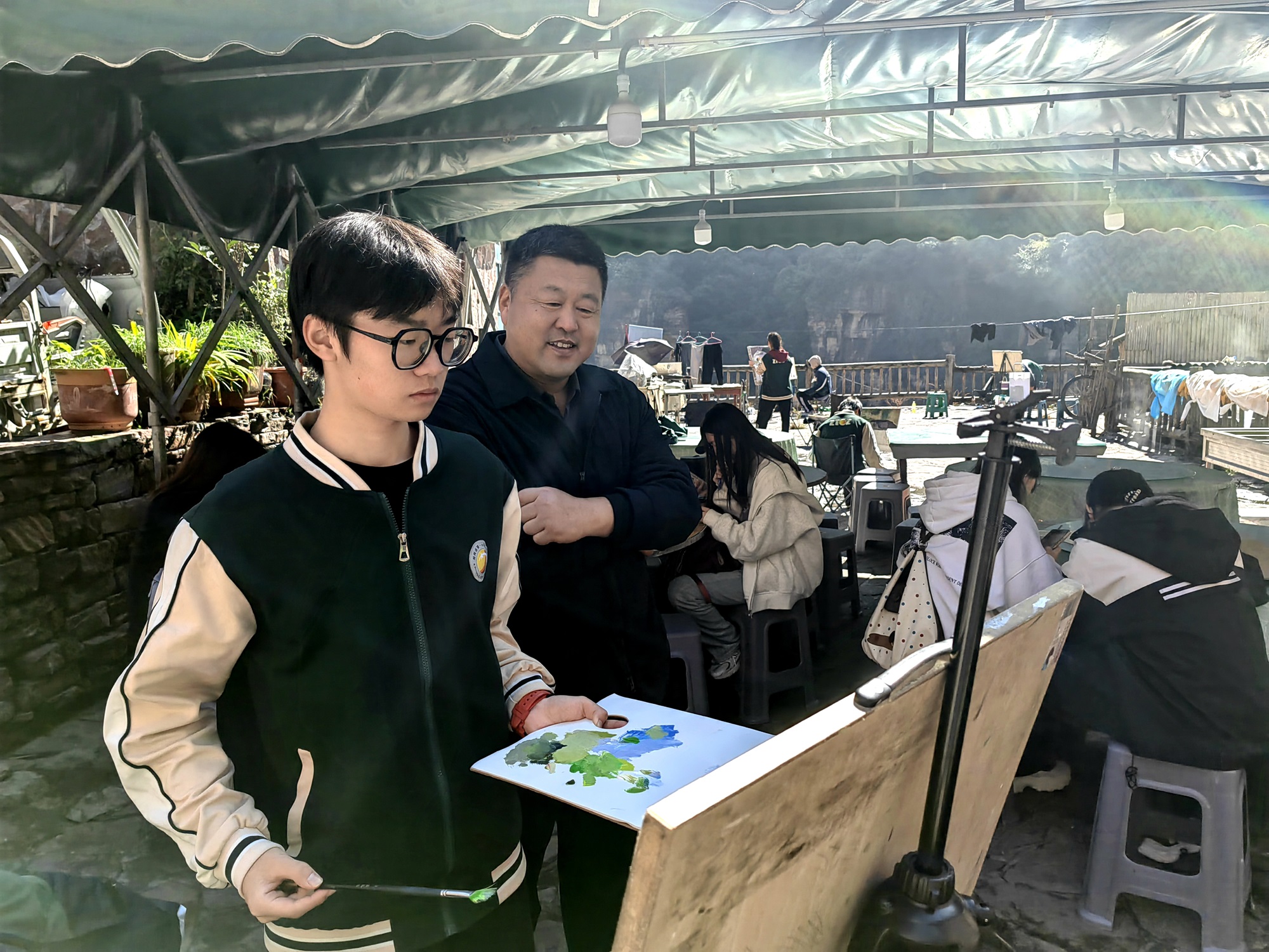 李明德还到各班级写生教学现场,细致察看学生创作过程。他沿着写生路线认真观看学生画作,并不时就线条处理、色彩运用、创作构思等方面与同学们进行亲切交流,了解创作思路和实践中的困难。李明德还与现场指导的美术教师深入交谈,详细了解高一、高二年级美术教学及学生专业发展情况,鼓励教师们坚持因材施教、精准指导的原则。同时,他对各班班主任在阴雨天气下坚守岗位、悉心育人的工作态度给予了高度肯定。