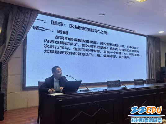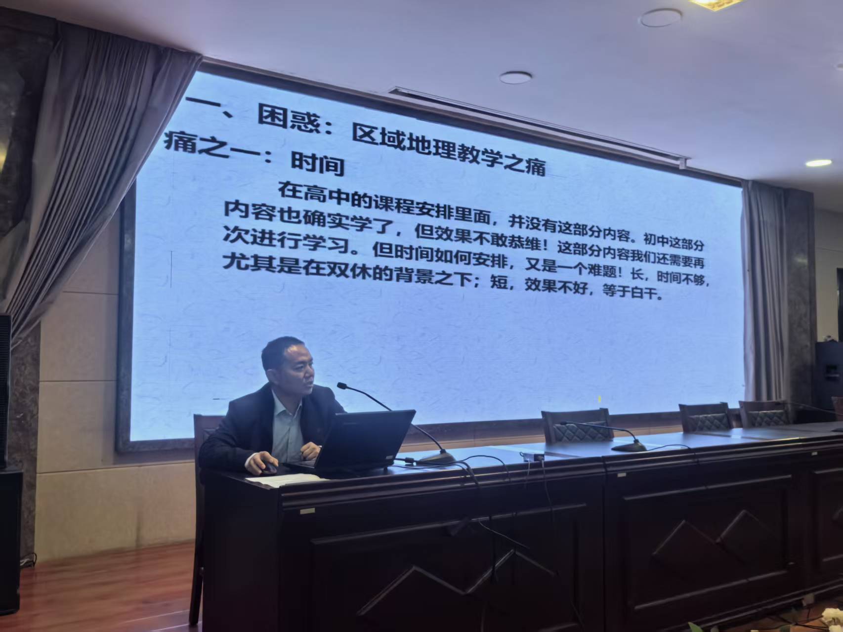中牟县第一高级中学教师韩延峰以《聚焦热点、巧用案例,活化区域地理课堂》为题进行了课例展示。他提出,区域地理学科教学应聚焦社会热点,将真实时事融入课堂,激发学生学习兴趣;同时,精选典型区域案例,以案例为载体,引导学生探究分析,提升综合素养。