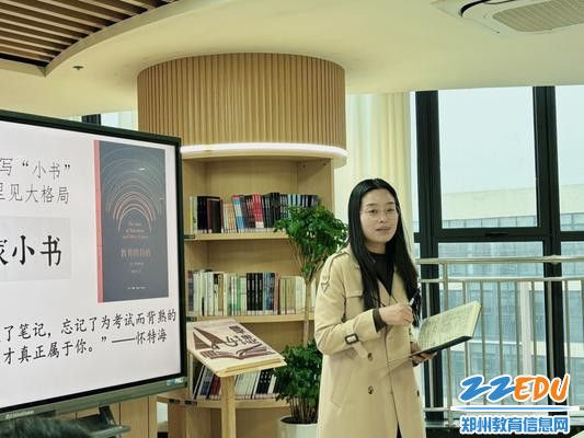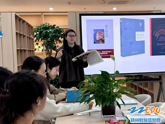 10月14日下午,郑州市第四十四高级中学第八期覃思读书分享会围绕怀特海(Alfred North Whitehead)的经典著作《教育的目的》举办“教育为灯思为路,共探育人真意长”专题分享会,程靖媛老师担任本次读书分享会的主持人。程靖媛以舒缓的语调引入“反对惰性知识、激发生命成长”的核心议题,为整场交流奠定了温暖而深刻的基调,随后自然引导语文教师胡孟果、英语教师雷艺文、历史教师武念炆依次分享,让“教育的目的”在不同学科视角下迎来碰撞的火花。