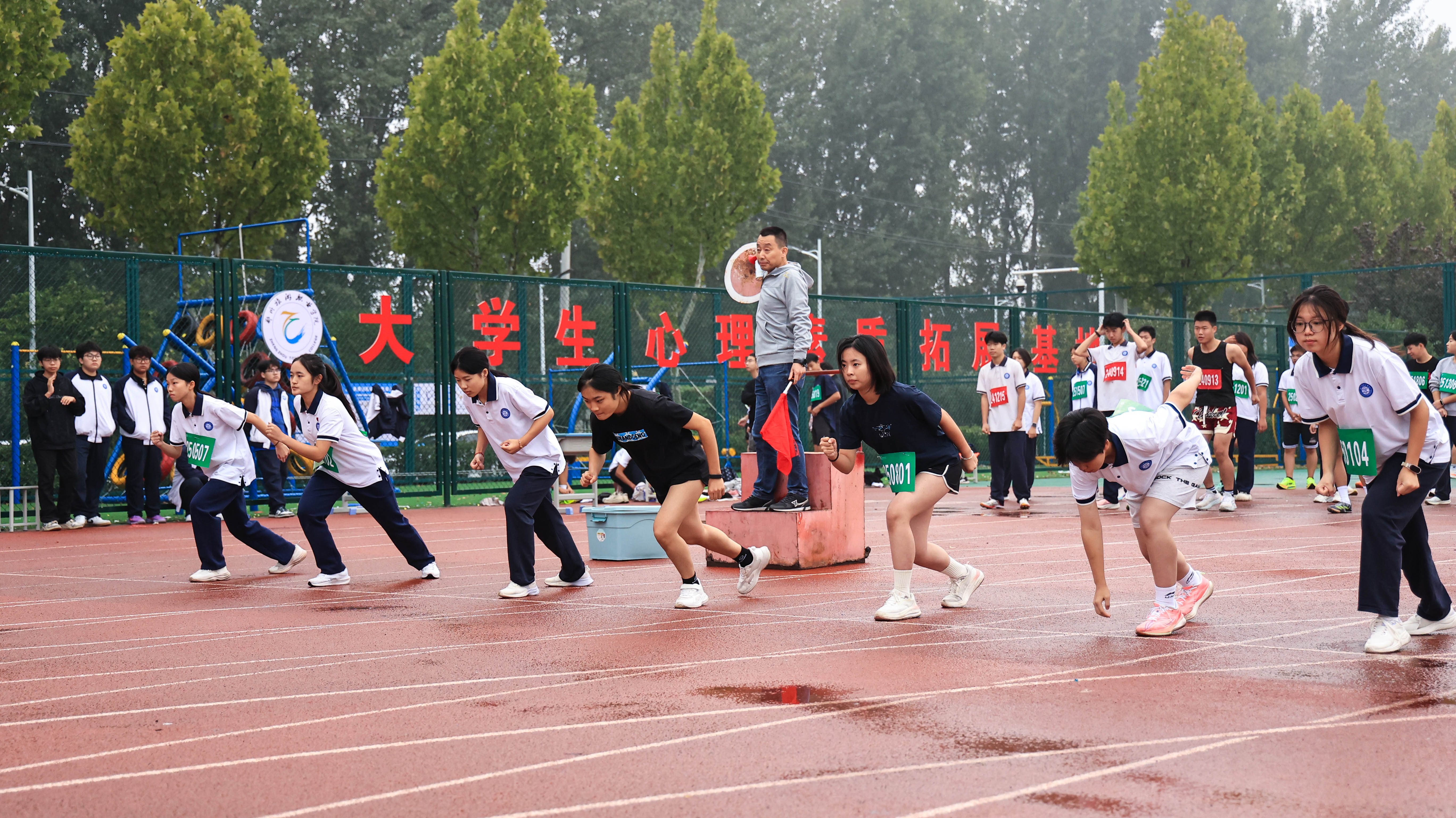 看台上,同学们的热情随着天气转晴而愈发高涨,此起彼伏的加油声在明媚的秋光中格外嘹亮。裁判员老师们认真负责,在雨后转晴的特殊场地条件下,确保了每项比赛的公平公正。接力赛场上,选手们的团队协作精神在阳光下熠熠生辉,每一次接力棒的传递都凝聚着共同的热血与梦想。