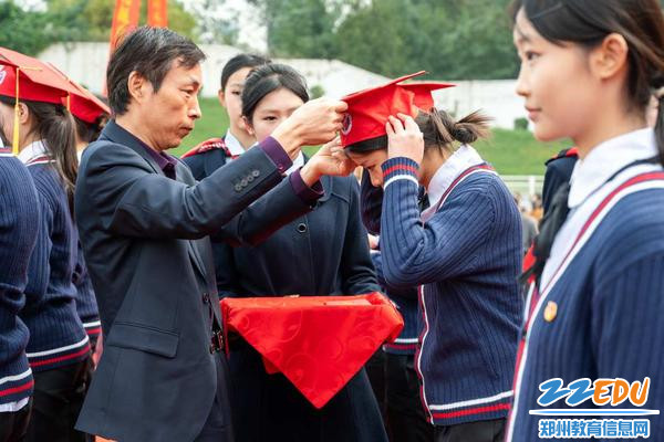 郑州市教育局党组成员、副局长李雷为学生代表佩戴成人帽
