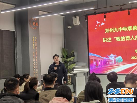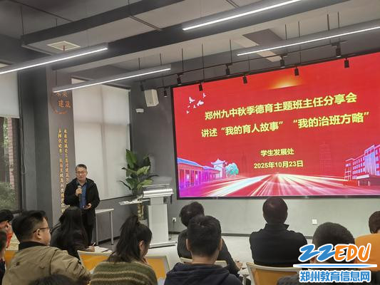 2025年10月23日下午,郑州九中学生发展中心交流热烈,学校秋季德育主题班主任分享会如期举行。会议以“讲述‘我的育人故事’‘我的治班方略’”为核心,全校班主任、青年教师参会。郑州九中党委书记周继莉、校长袁伟民现场指导,学生发展处主任王大昀主持会议。