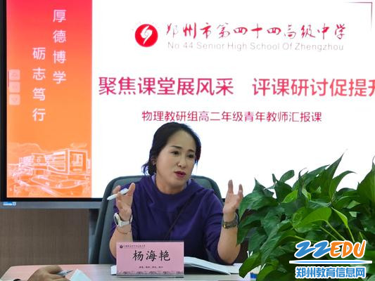 在随后的评课环节,郑州市第四十四高级中学副校长杨海艳对本节课进行了全面而深入的点评。她谈到,李争亚的课程设计体现了“从生活走向物理”的教学理念,情境创设真实而富有启发性,有效激发了学生的学习兴趣。她特别肯定了本节课在实验教学方面的扎实安排,认为李争亚通过层层递进的教学环节,将理论讲解与学生实践有机结合,符合物理学科以实验为基础的教学规律。