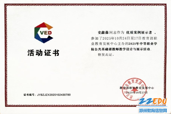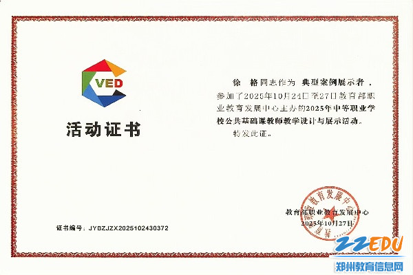 2025年10月24日-27日,2025年中等职业学校公共基础课教师教学设计与展示活动在山东省青岛市胶州市举行。郑州市商贸管理学校两名教师在2025年中等职业学校公共基础课教师教学设计与展示活动中喜获佳绩:青年教师徐格凭借精湛的教学技艺、独特的教学设计和出色的现场发挥,在众多高手中脱颖而出,荣获全国一等奖“典型案例展示者”,教学课例被教育部遴选为典型案例,将纳入“智慧职教”平台面向全国推广;史鑫淼老师也同样优秀,荣获全国二等奖“优质案例展示者”。