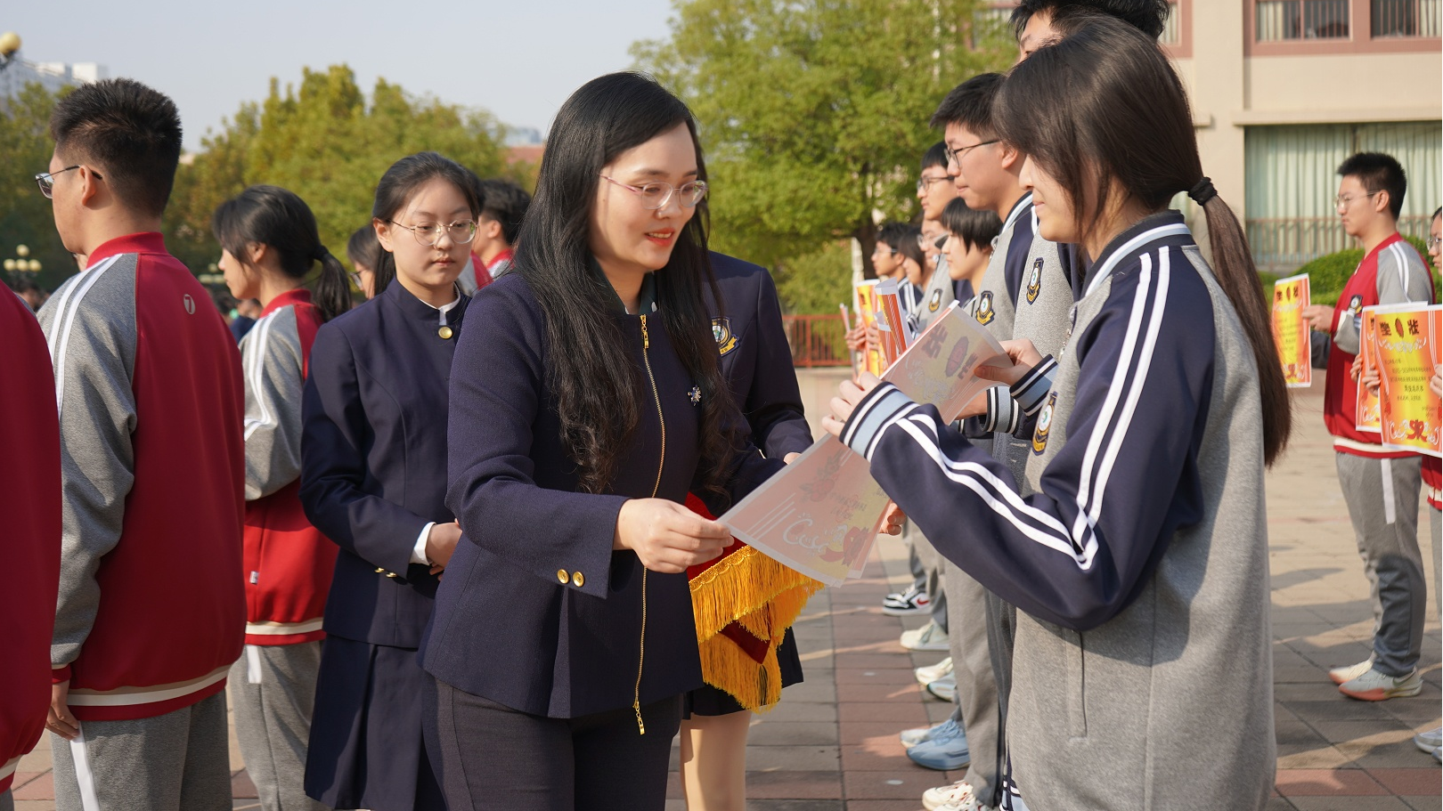 上午9时40分,仪式拉开序幕。由2024级高二16班路佳凝、高二7班张可歆等6名优秀团员担任旗手,高二年级18名优秀团员组成的护旗手队伍,迈着整齐划一的步伐护送国旗入场。伴随着雄壮激昂的国歌声,五星红旗冉冉升起,全体师生肃立行注目礼,高唱国歌,滚烫的爱国情怀与安全守护的责任意识在每个人心中激荡,嘹亮的旋律久久回荡在校园上空。国歌唱毕,校歌奏响,嘹亮歌声传递出学子的昂扬风貌;随后,全体同学举起右拳庄严宣誓“自信 自律 自强 求真 博雅 向上”,铿锵誓言彰显青春担当,为本次安全教育月活动注入庄重而坚定的底色。