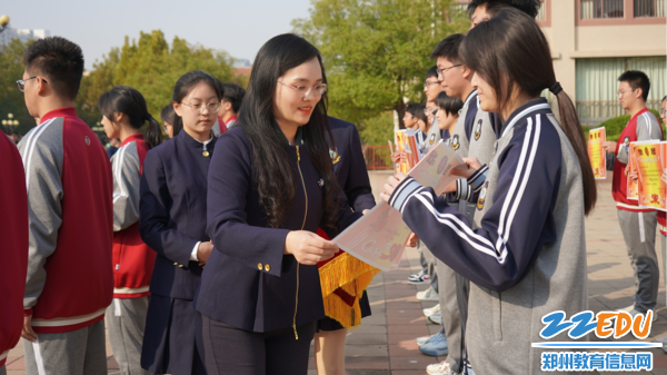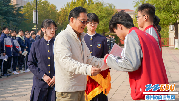 郑州市第七高级中学党委书记王保军为获奖班级代表颁发奖状