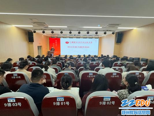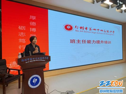 为加强班主任队伍建设,提升班主任的专业素养和育人能力,探索新时代班级管理的新路径、新方法,11月4日下午,郑州市第四十四高级中学特邀河南省首届“十佳”班主任、“出彩河南人”2023最美教师、河南省济源第一中学教科室主任秦望亲临授课,全校正副班主任参与培训,会议由学校政教处副主任郑润雨主持。