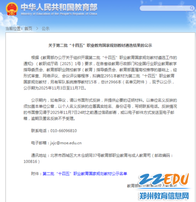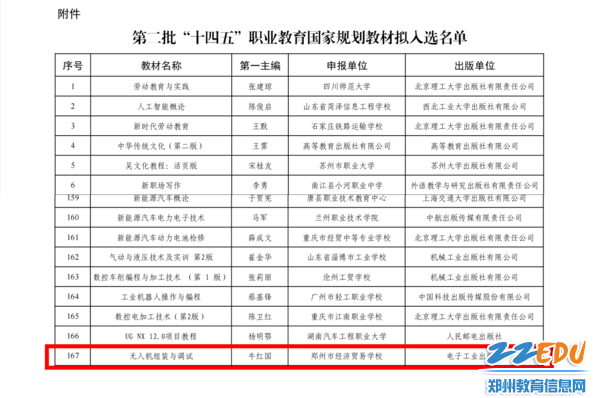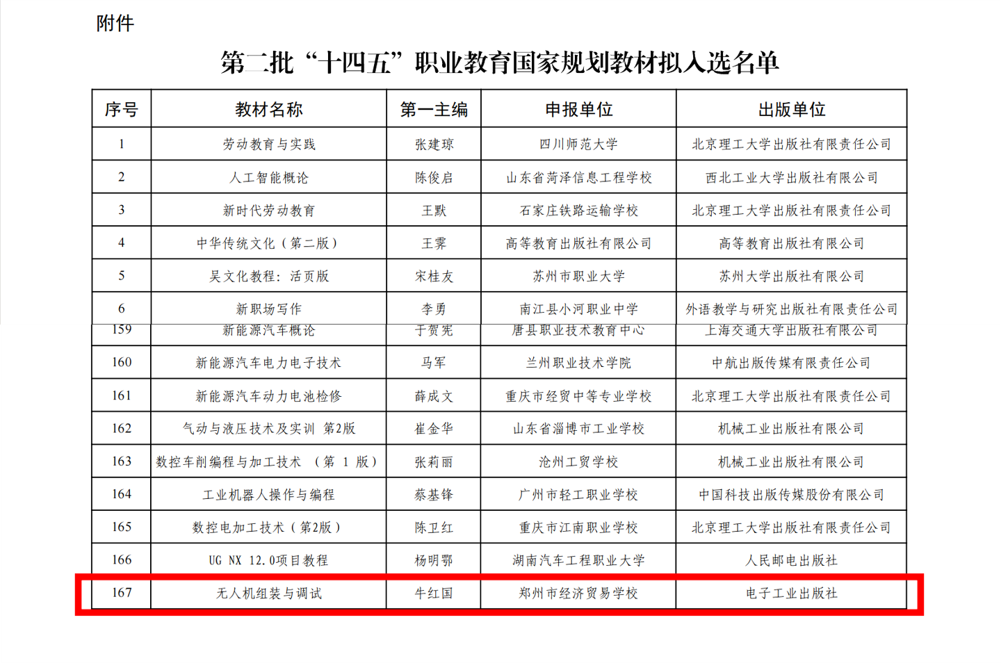 11月3日—7日,教育部职业教育与成人教育司公示第二批“十四五”职业教育国家规划教材名单,由郑州市经济贸易学校无人机操控与维护专业团队主编的《无人机组装与调试》教材成功入选!这是该专业继去年荣获世界职业院校技能大赛金奖、今年再获两项银奖后的又一重大突破。