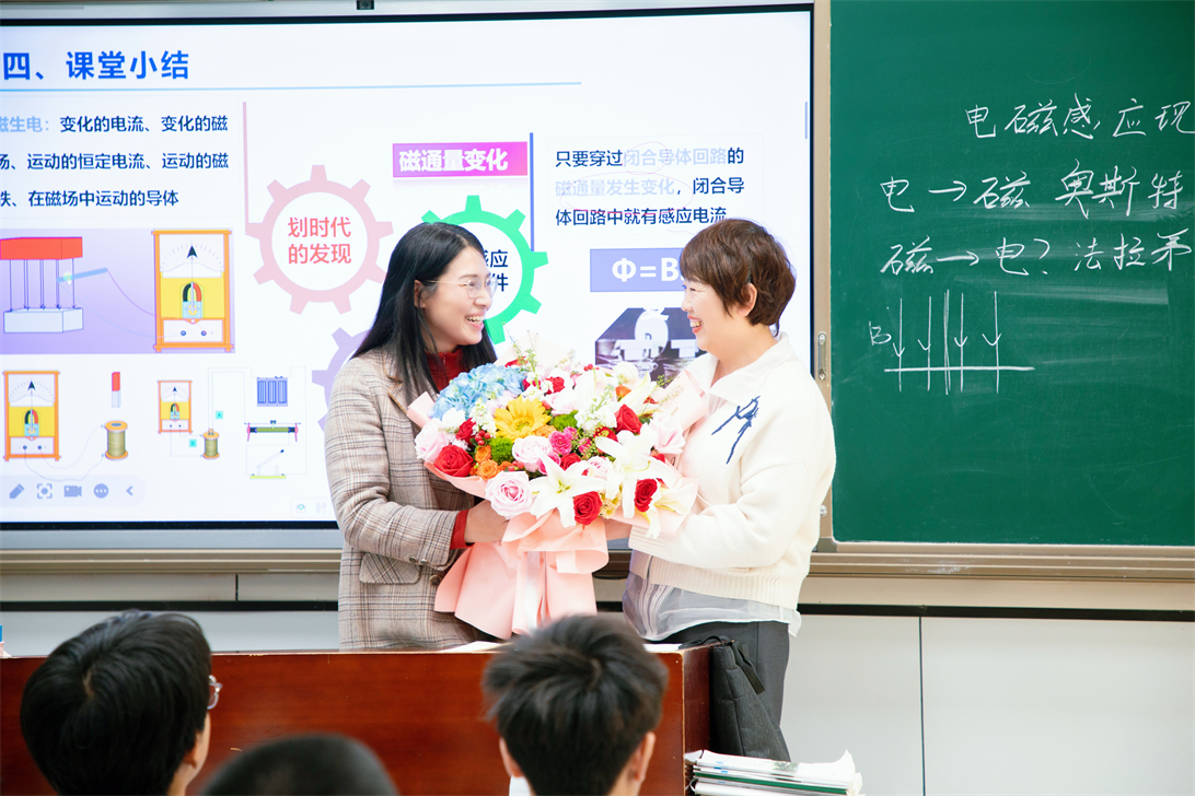 课后,在学生们热烈的掌声里,张莹将代表敬意与关怀的花束送到杨静老师手中。“杨老师,学校一直记挂着你的腿伤,希望你好好休养,保重身体,但你始终放不下班里的学生。”张莹的语气中充满关心与敬意,“你这份对学生的爱与责任,令人动容,也以实际行动诠释了‘言为士则、行为世范’的深刻内涵。”张莹转而面向学生说道:“同学们,你们眼前的杨老师,就是大家值得感恩的人。感恩从不是挂在嘴边的口号,而是藏在认真听课的专注里、藏在对老师的体谅里、藏在传承这份奉献精神的行动里,希望你们记得这份默默的守护,带着感恩之心成长,扛起属于自己的责任与使命,向我们的优秀校友学习,努力成为行业翘楚,做一个有情有义有大爱的时代新人。”