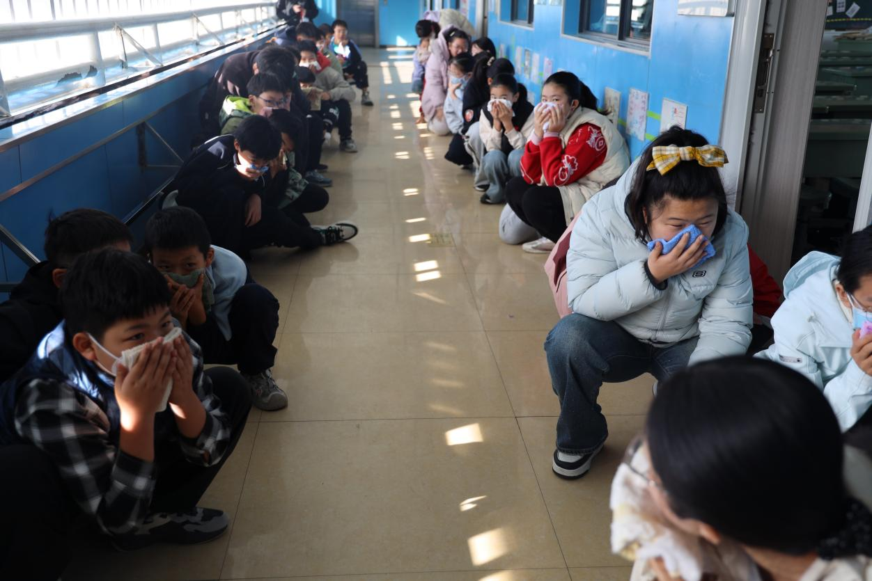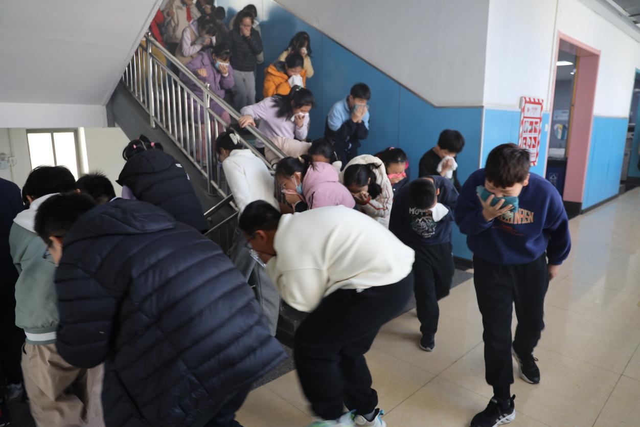 上午10点10分,楼层值岗教师提前到岗,演练正式启动。在消防警报声中各班正副班主任组织学生用湿毛巾捂住口鼻,弯腰低姿有序撤离教室,沿指定路线快速向操场集结。楼层值岗教师在楼梯口、拐角处全程值守,纠正行进姿势,严防拥挤踩踏,整个过程紧张有序、衔接顺畅。疏散完毕后,各班按指定区域整队,班主任快速清点人数并向演练计时员汇报撤离人数。
