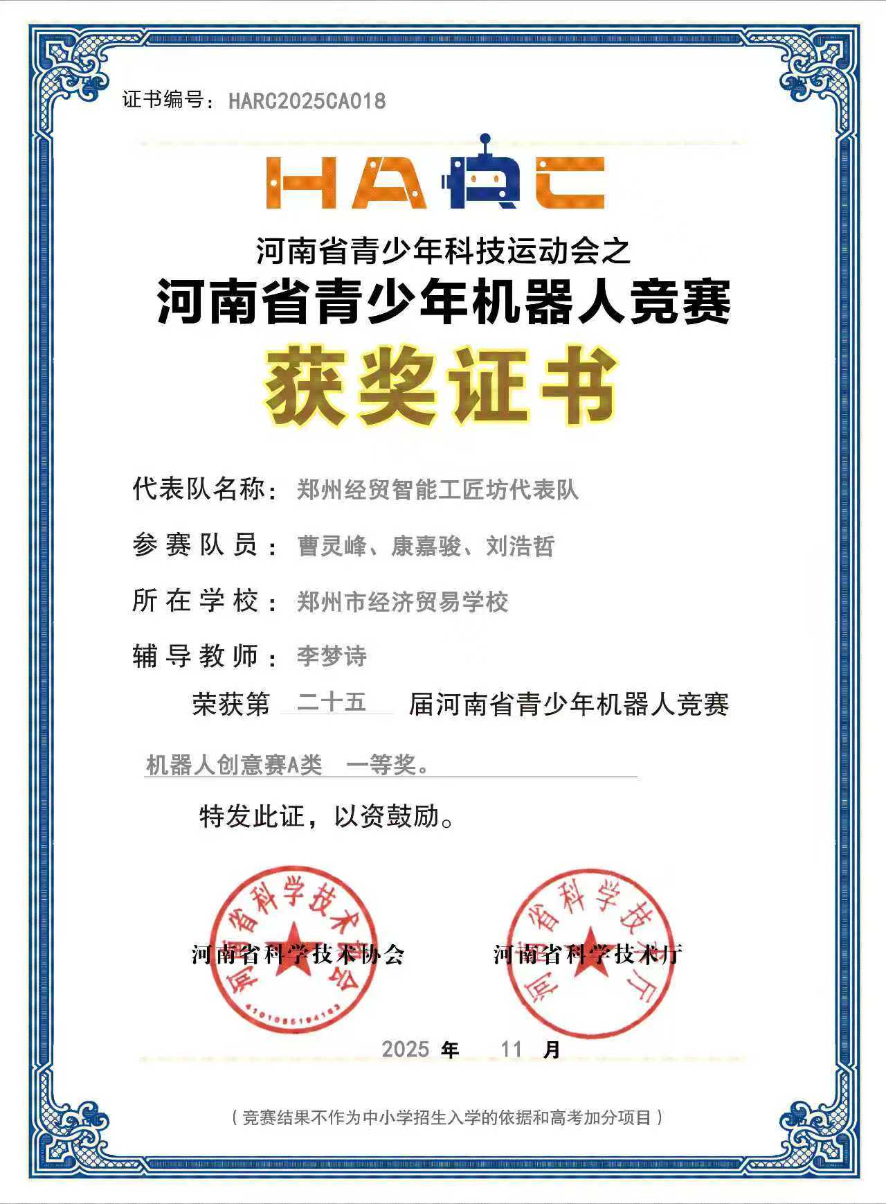 学校智能工匠坊代表队获第二十五届河南省青少年机器人竞赛机器人创意赛A类一等奖