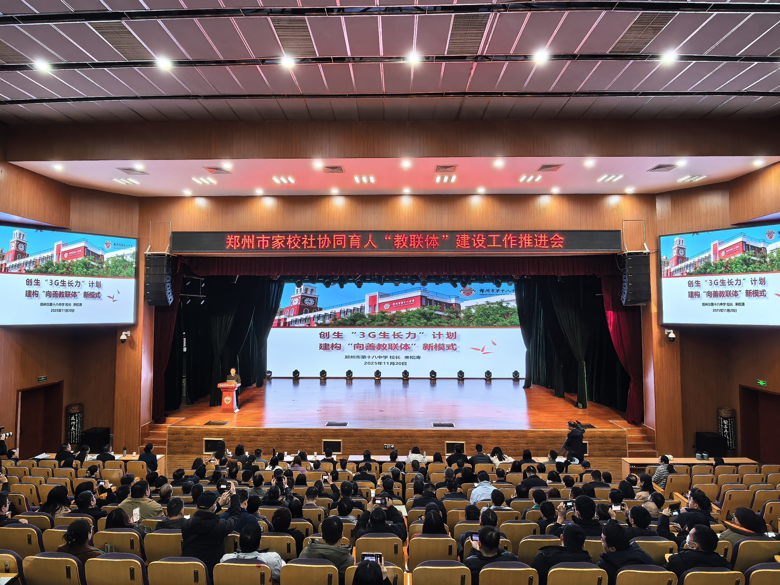 2025年11月20日上午,由郑州市教育局主办的郑州市家校社协同育人“教联体”建设工作推进会在郑州市第十八中学报告厅召开。会上,郑州市第十八中学校长来松涛以“创生‘3G生长力’计划,建构‘向善教联体’新模式”为主题作典型经验交流,系统介绍了学校在“教联体”建设方面的深入探索与成功实践。