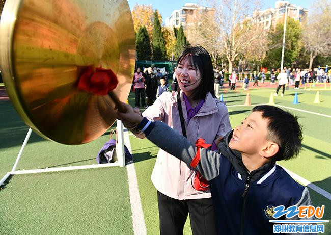 全班完成体能大循环后学生与老师一起敲响铜锣