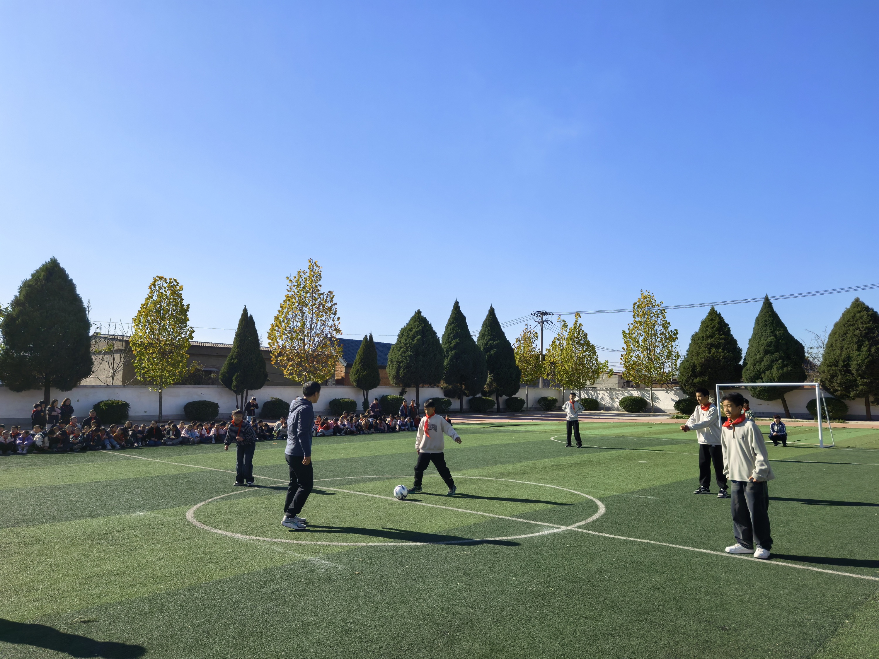随后,两校师生移步操场,共同参与了一场别开生面的“阳光体育课”。在郑州市盲聋哑学校门鑫老师的带领下,学生们进行了专业的运动前准备拉伸练习,大家积极参与,现场气氛活跃。由郑州市盲聋哑学校“聋足社团”冶鹏展老师带领的足球友谊赛将活动推向了高潮,聋人足球运动员与新密市米村镇米村小学的同学们在绿茵场上默契配合,尽情奔跑。