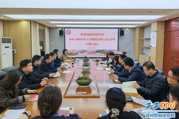 为了进一步总结前期工作经验,明确今后工作重点,厘清方向,精准施策,确保学期任务顺利完成,2025年11月27日,郑州市商贸管理学校召开本学期项目执行责任清单中期汇报会。会议由学校副校长张文远主持,学校全体中层以上干部参加。