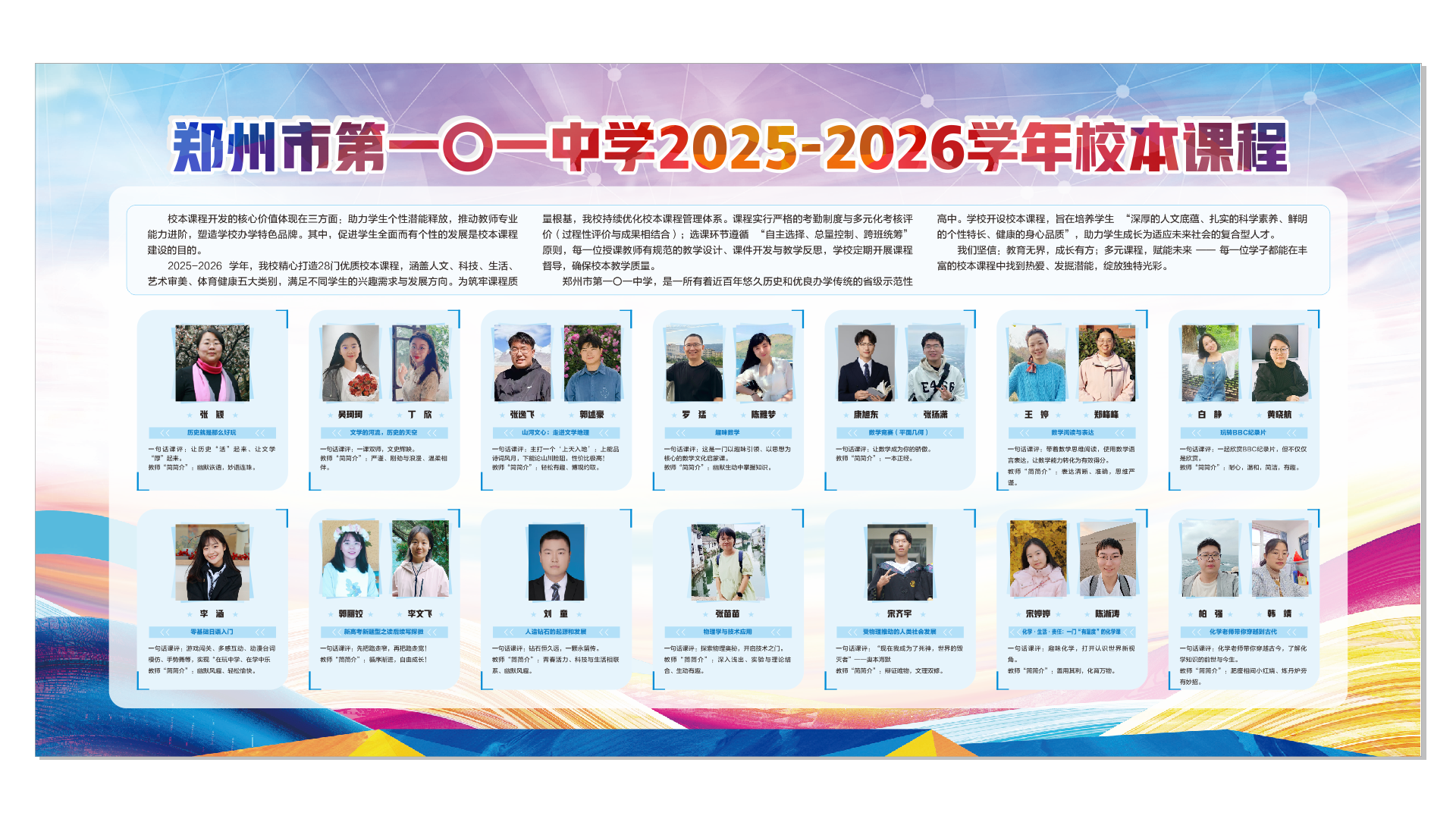 冬意渐浓,学趣正酣。为进一步深化教育改革,落实“五育并举”的育人目标,满足学生个性化成长需求,郑州市第一〇一中学2025—2026学年校本课程于11月28日正式开讲。教师发展中心精心筹备,为广大学生献上一场既有专业深度,又有人文温度的课程盛宴,旨在让同学们在课本知识之外,探寻一片属于自己的兴趣星空。