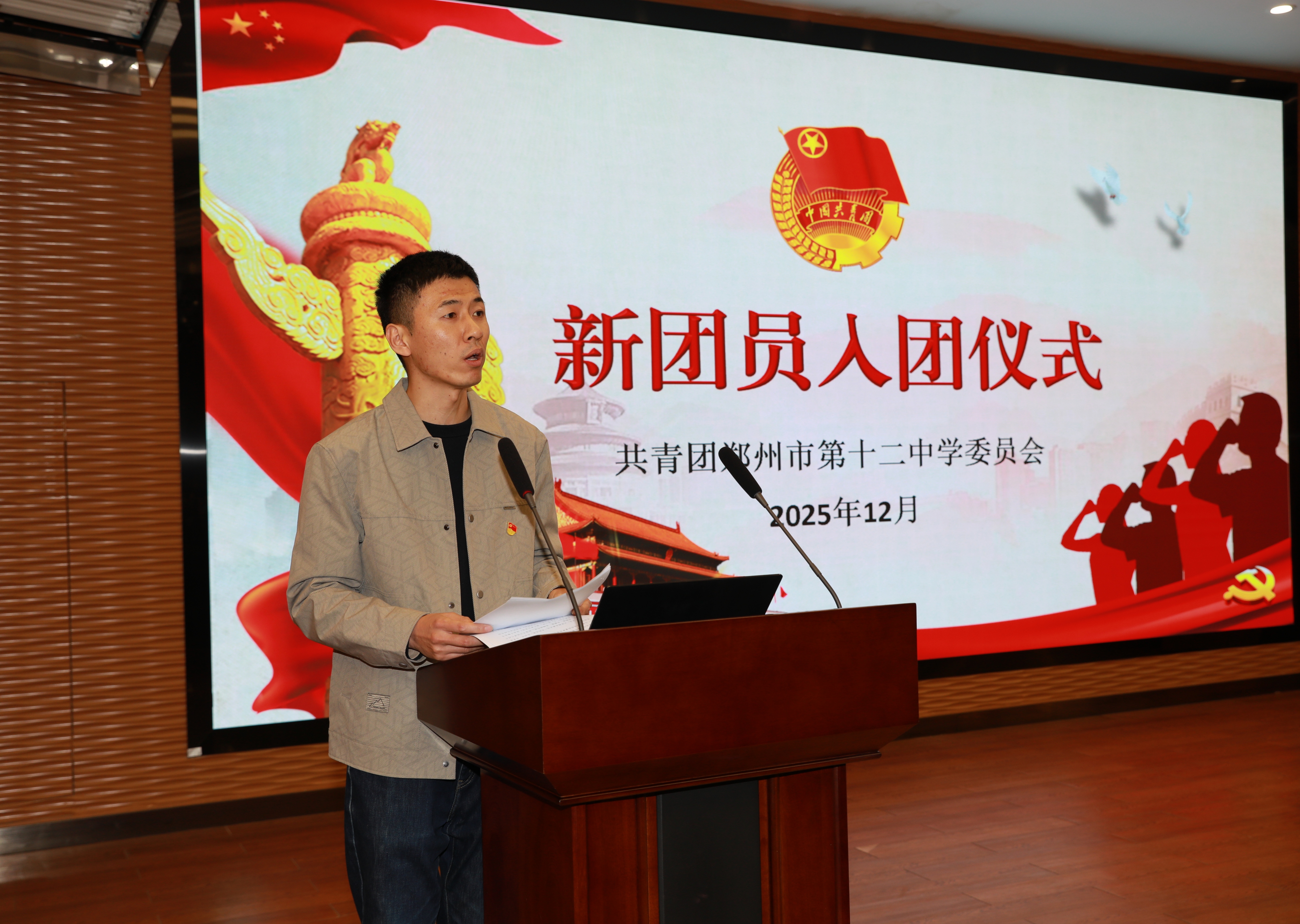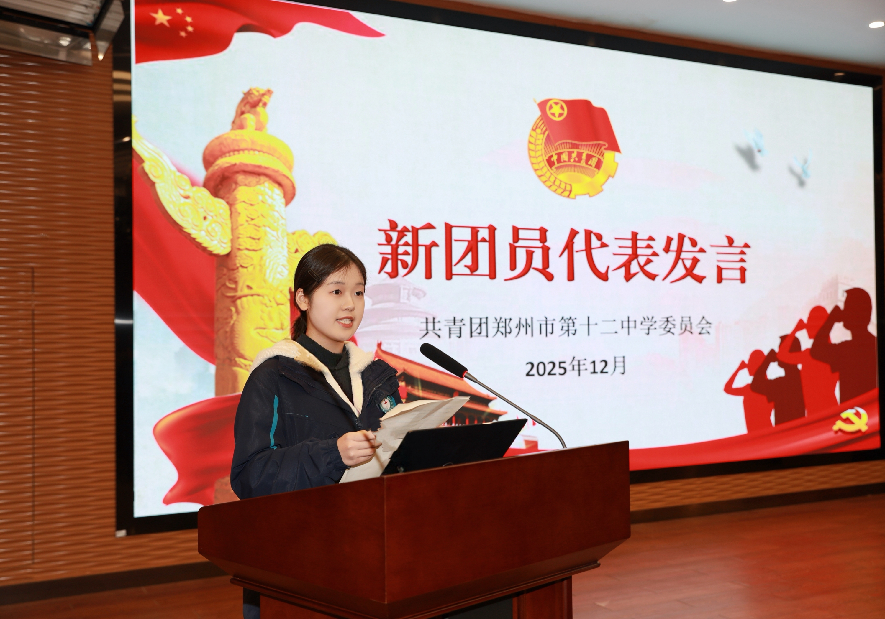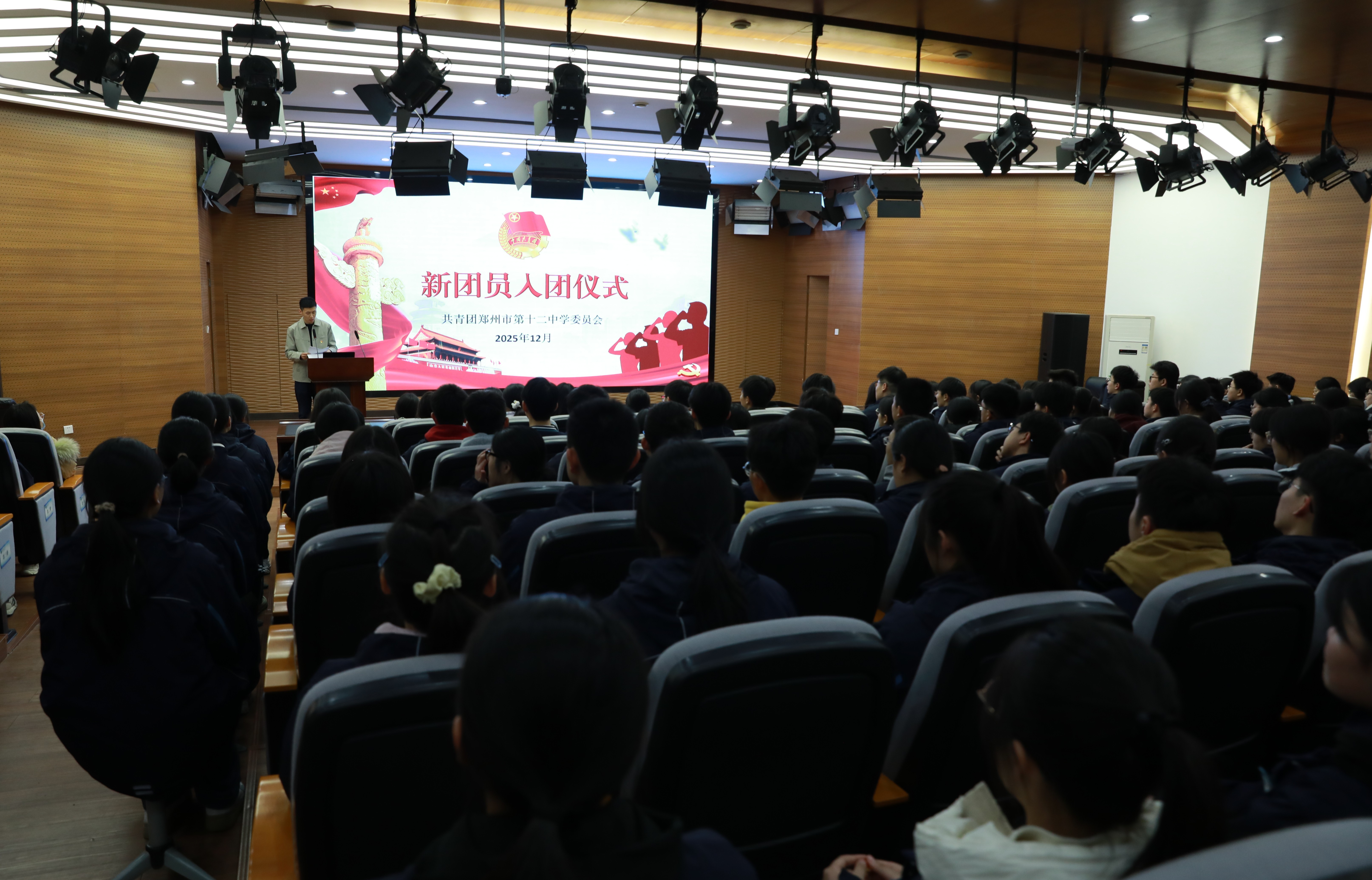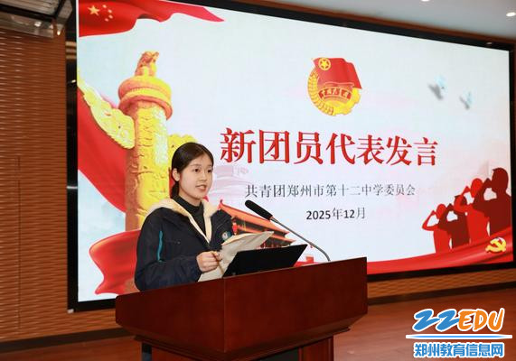 鲜艳的团旗迎风飘扬,金色的团徽绽放光芒,青春的团歌昂扬嘹亮,庄严的团员证贴心珍藏。12月24日下午,郑州市第十二中学为280名新团员举行庄严的入团仪式。在师长的共同见证下,学子们光荣的佩戴上团徽徽章,面向团旗庄严宣誓,正式成为中国共产主义青年团的一员。仪式后,校党委书记陈立新以“在历史的交汇点成长——读懂时代,筑梦未来”为主题,为新团员讲授了一堂生动的思政课,激励大家将青春理想融入国家发展的时代征程。