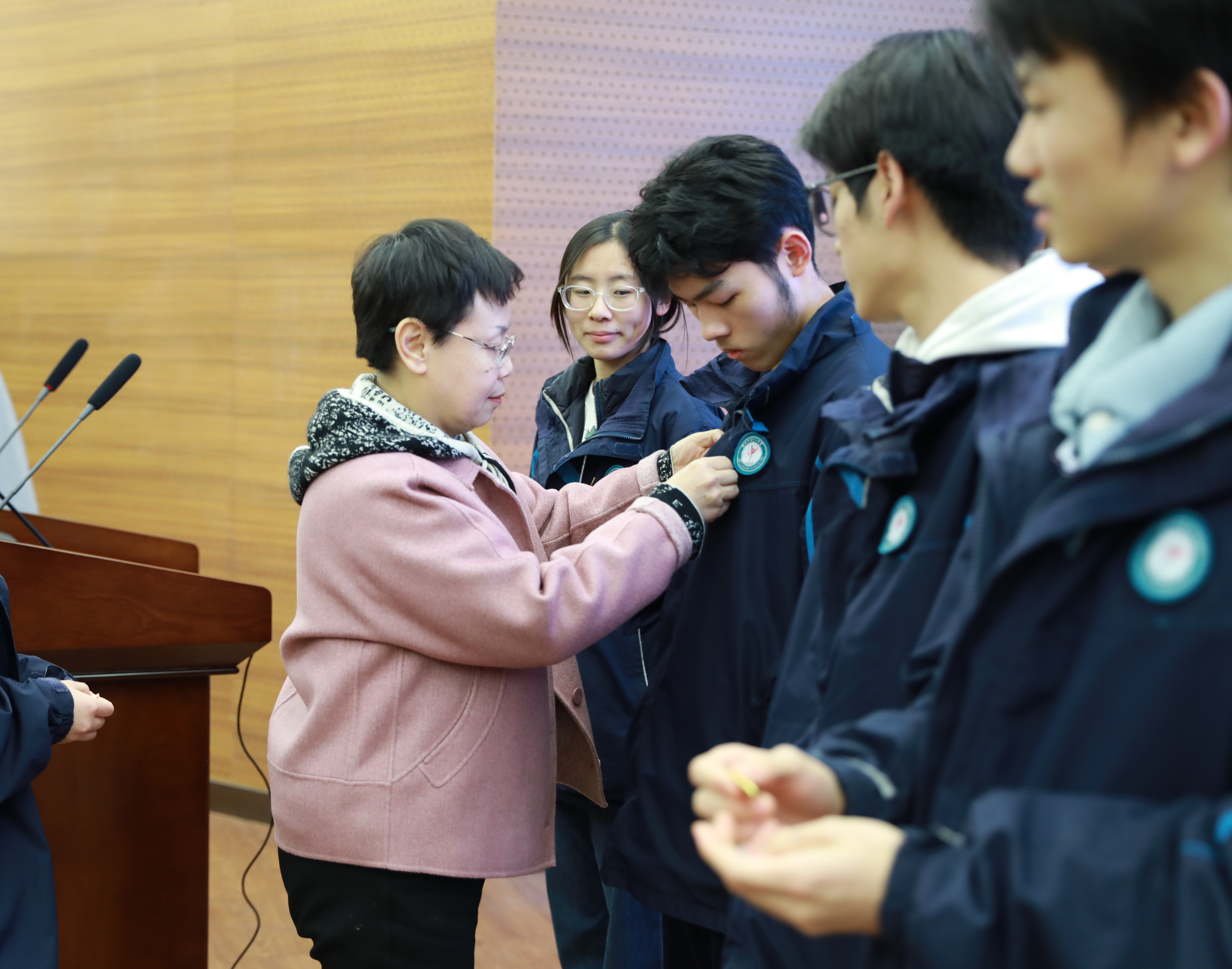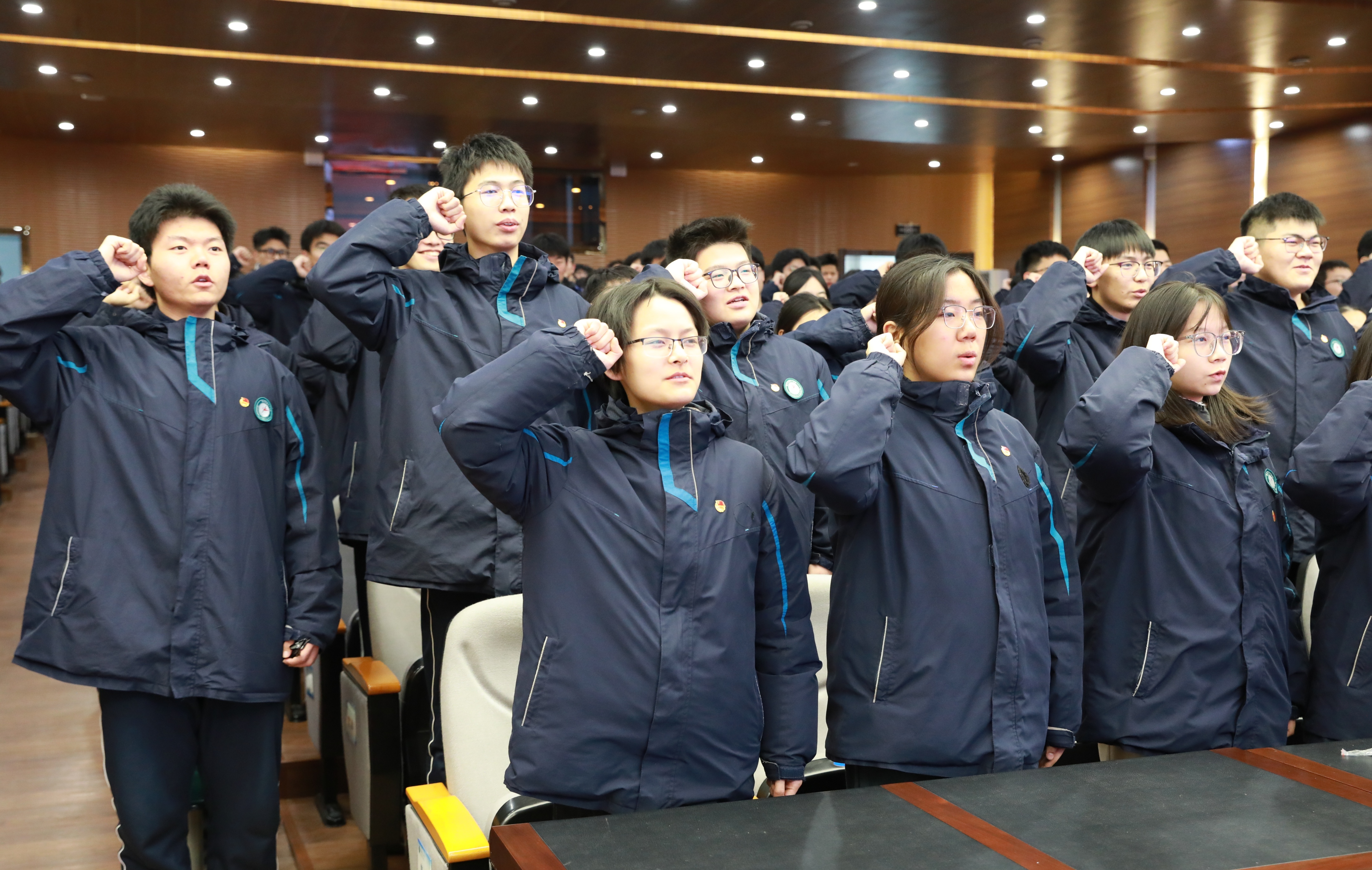 入团仪式在雄壮的国歌声中拉开帷幕。校团委副书记王超伟宣读新团员名单,校党委书记陈立新为新团员代表逐一佩戴团徽徽章。全体新团员高举右拳,在领誓人高一博的带领下,面对团旗立下铿锵誓言,目光坚定,展现出新时代青年听党话、跟党走的思想自觉与行动决心。
